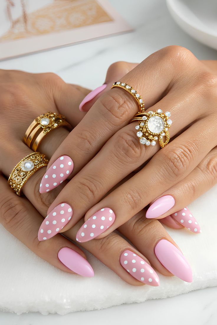 A glossy blush-pink base is decorated with small white polka dots for a polished yet cute finish. It feels feminine, classy, and ideal for everyday spring wear.