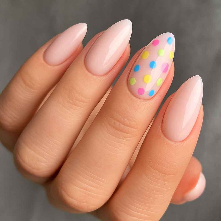 Most nails keep a simple nude-pink look, while one accent nail pops with colorful pastel polka dots. The style is modern, balanced, and subtly playful.