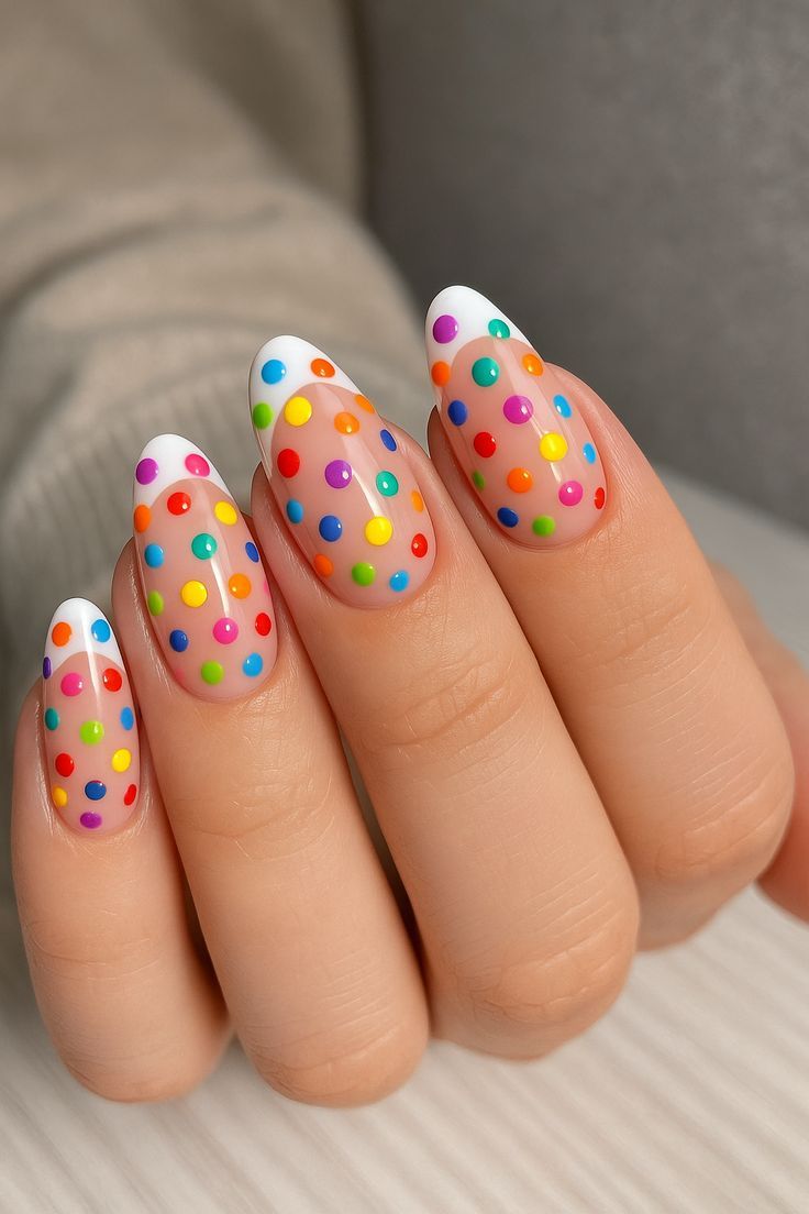 This design features a sheer nude base with crisp white French tips covered in colorful polka dots. The look feels playful, bright, and perfect for a cheerful spring mood.