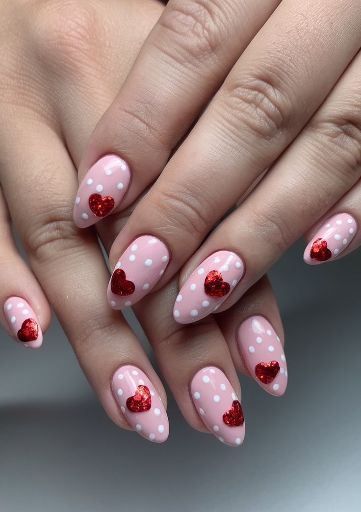 Blush pink nails with white polka dots are paired with bold red heart accents for a romantic touch. The vibe is sweet, feminine, and perfect for springtime dates or celebrations.