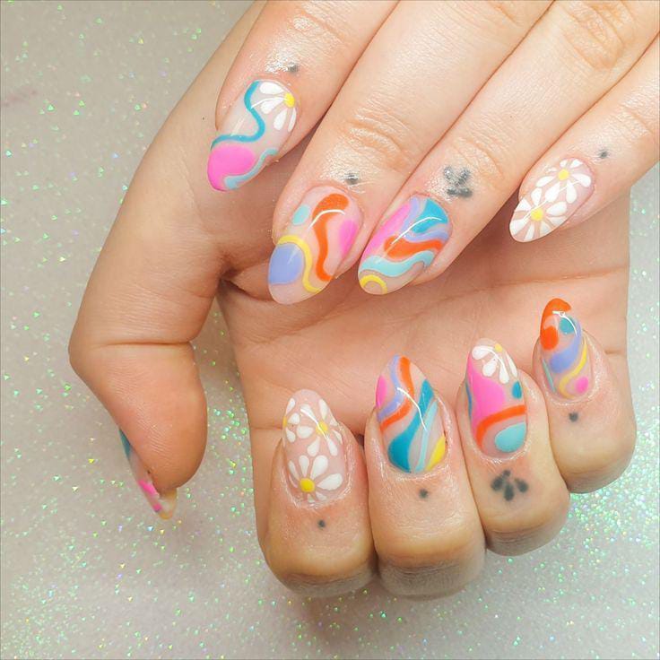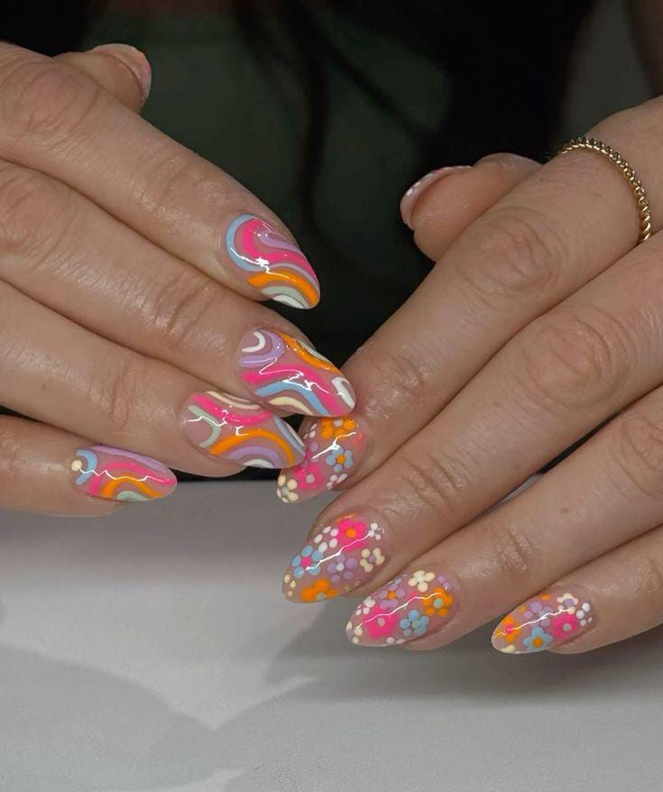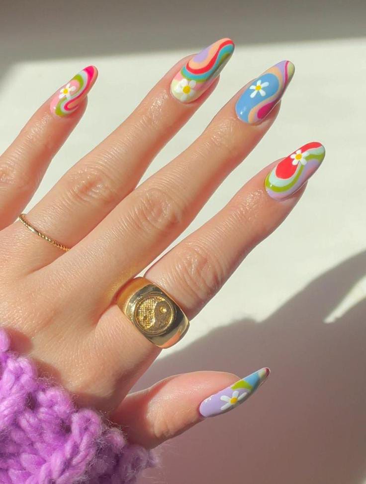 A mix of bold color swirls like red, blue, green and pink with small floral details adds a playful, springtime energy to the nails, perfect for a light, breezy look.