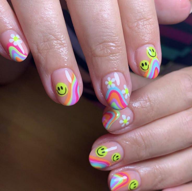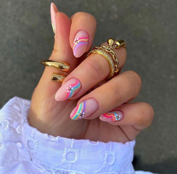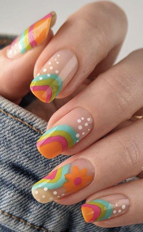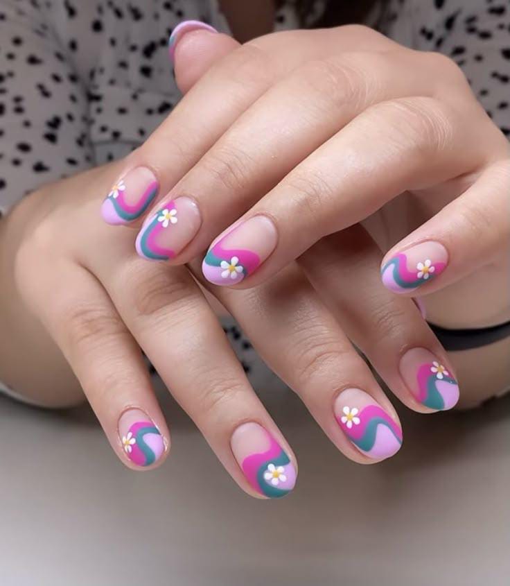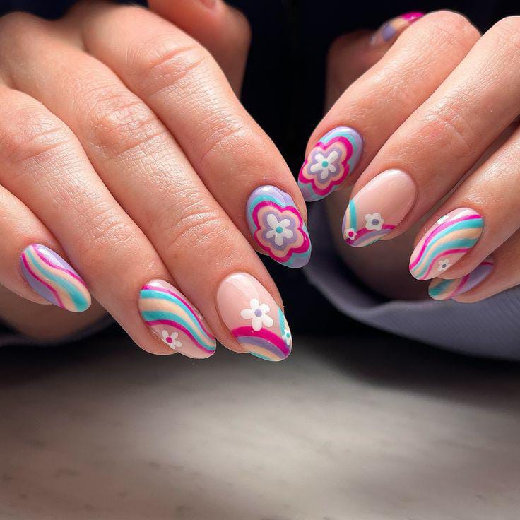 Multicolored pastel swirls blend seamlessly with delicate floral details on a nude base. The design feels lively, artistic, and full of cheerful spring energy.