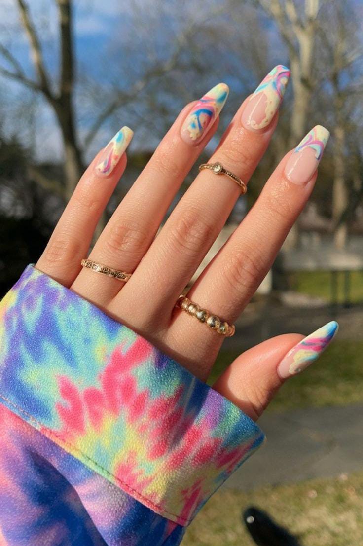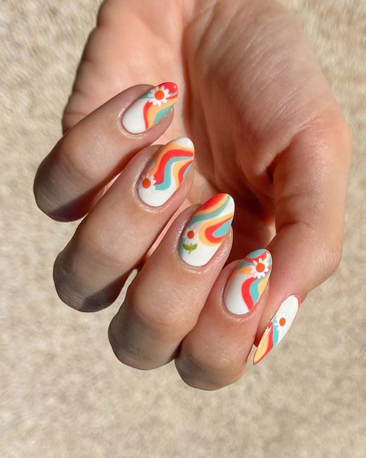 Bright rainbow swirls in red, blue, yellow, and orange create a dynamic and energetic look. This vibrant design is fun and modern, perfect for those who love playful spring nail art.