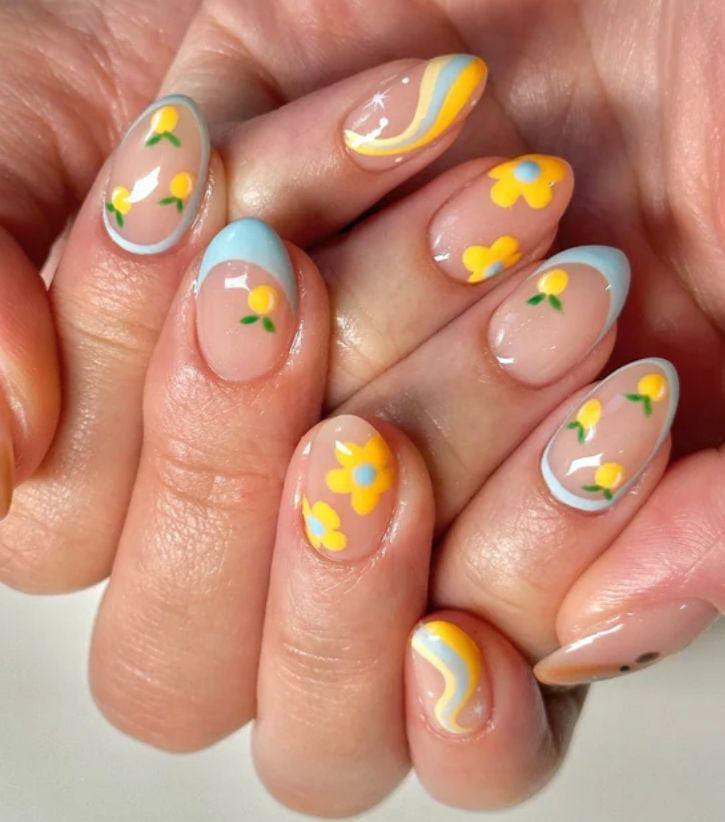 Soft yellow flowers with green leaves on a neutral tip base with blue, yellow swirls create a simple, refreshing spring design. This soft floral pattern has a laid-back, cheerful feel for the season.