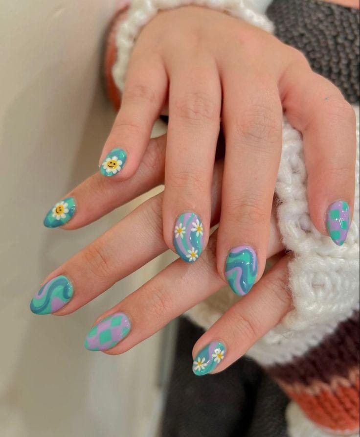 Soft mint and lavender swirls flow across the nails, accented with tiny white-and-yellow daisies. The overall look feels fresh, playful, and perfectly suited for spring.