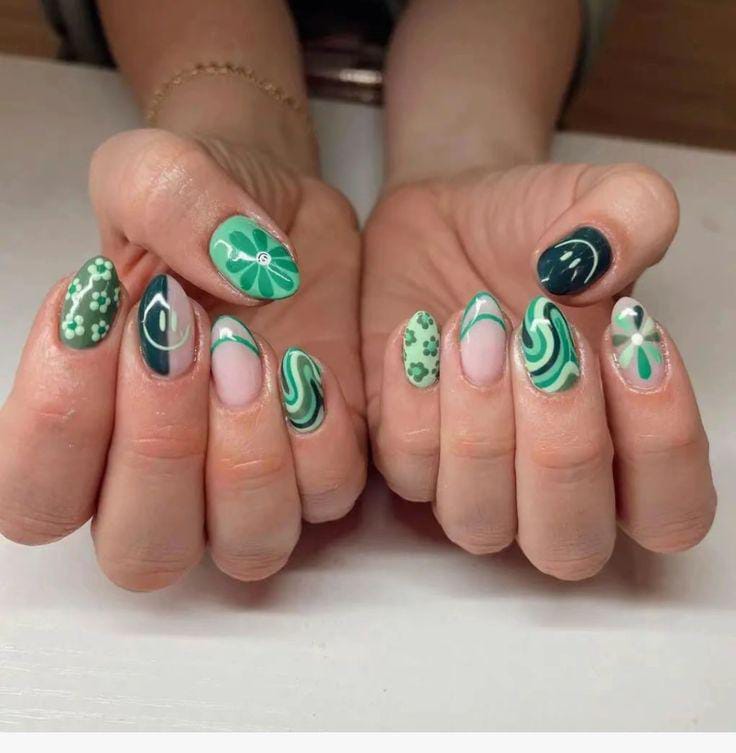 Shades of green swirl together with subtle floral and dot tip nail accents, balanced by negative space. The vibe is fresh, earthy, and inspired by early spring greenery.