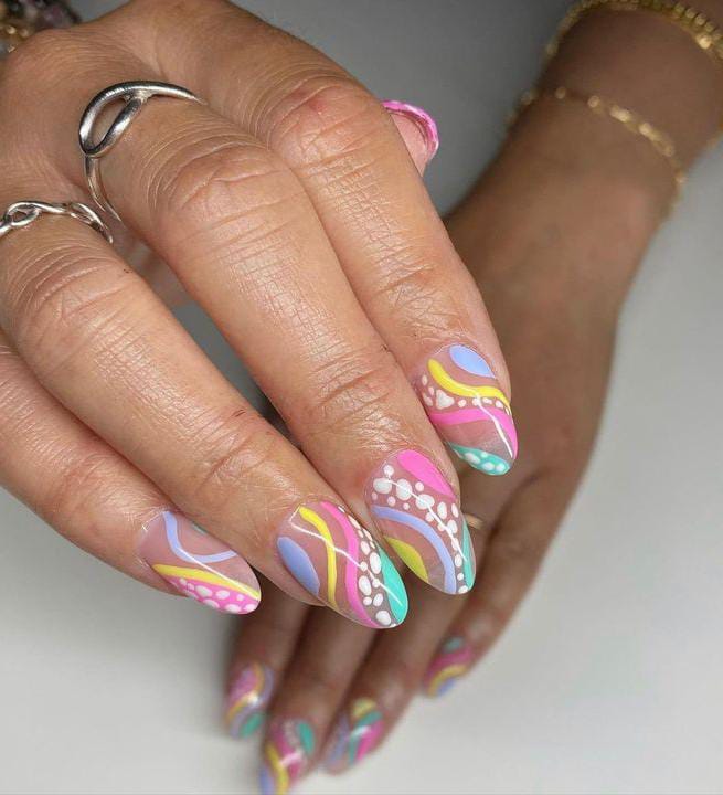 Flowing swirls in pink, blue, yellow, and lilac create a soft candy-like effect with dots. This design feels light, fun, and effortlessly youthful spring aesthetic.