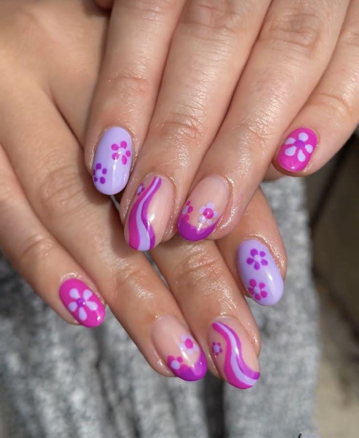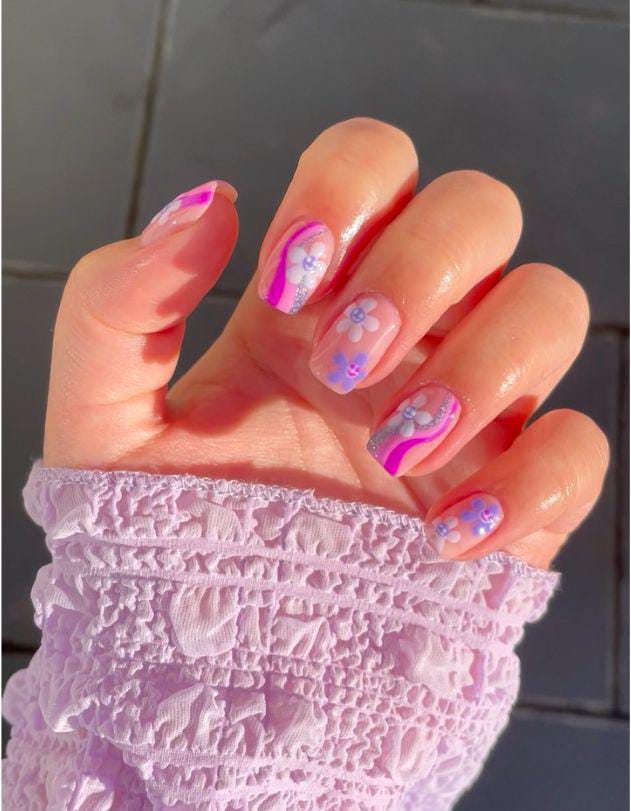 Soft purple and pink tones swirl together with delicate white and purple flowers scattered across the nails, stubble glitter. The design is calm yet vibrant, embodying the pastel spring aesthetic.