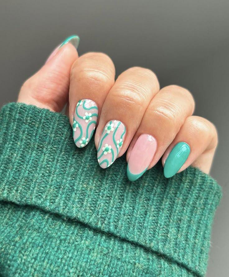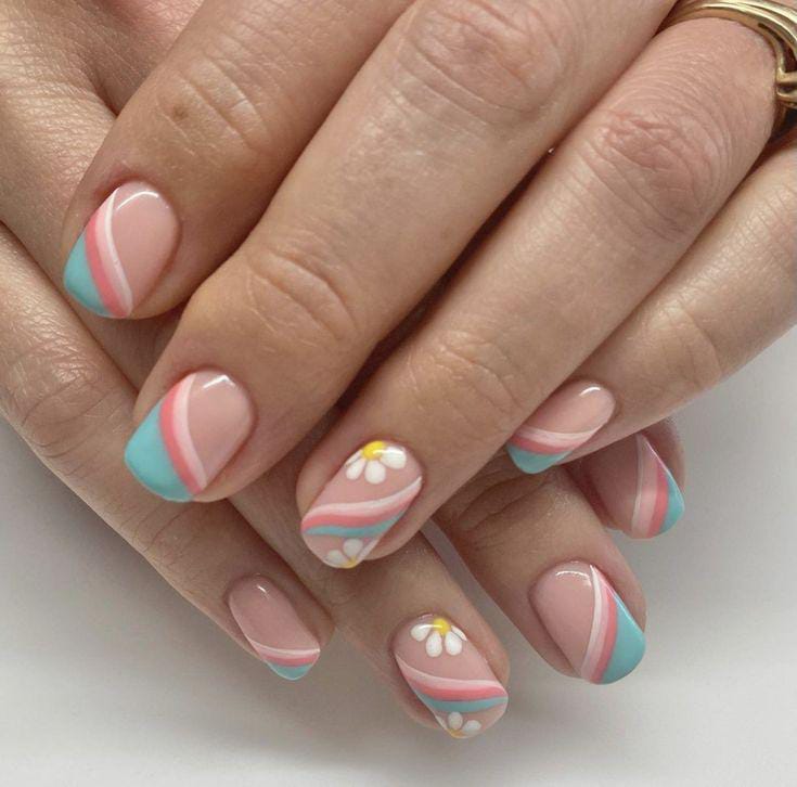A soft pastel pink and turquoise tip design with whimsical swirls and floral accents. The overall vibe is fresh, playful, and perfect for spring.