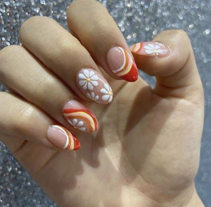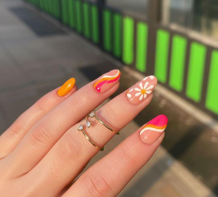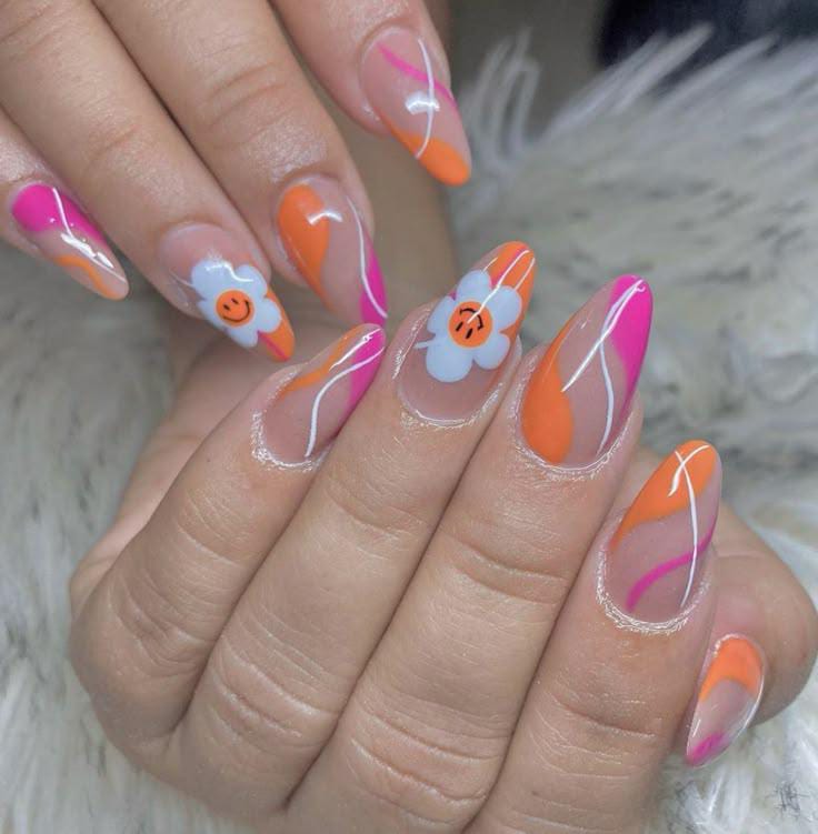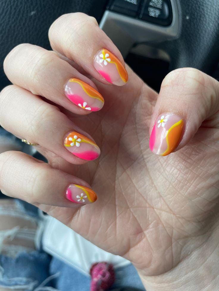 This design features bold pink, orange and white swirls with small yellow-centered daisies scattered across the nails. The bright colors give a fun and cheerful spring vibe, perfect for a fresh look.