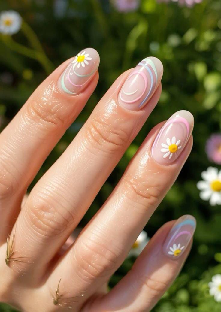 A subtle pastel color scheme featuring soft pinks, blues, and greens swirled across the nails. Each nail is finished off with a cute, delicate daisy design for a springtime, airy feel.