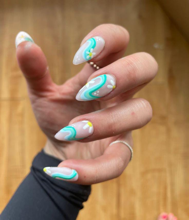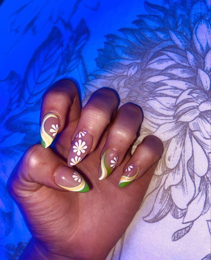 These soft nude pinks and yellows with little daisy flower details bring a soft, vintage charm to the nails. The flowy swirl patterns combined with the bright flowers create a carefree, spring-inspired design.