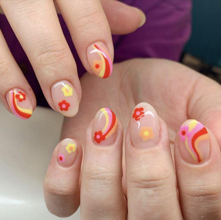 A warm and vibrant nail design with a mix of red, orange, and yellow swirls paired with playful floral accents. The overall look is cheerful and reminiscent of a sunset spring.