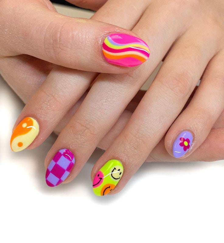 Bright neon shades of pink, orange, and multi-colored swirls with pink, orange accents create a bold, candy-like aesthetic. This design gives off a cheerful, youthful vibe perfect for a bold spring look.