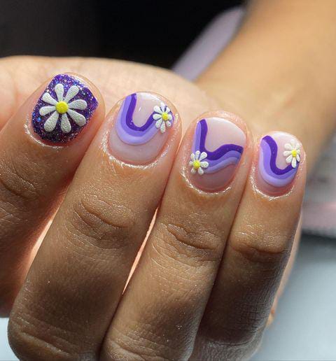 These soft nude bases calming lavender, lilac and soft purple swirls with delicate white daisies, creating a soft and dreamy spring vibe.