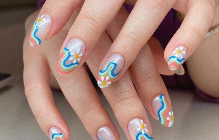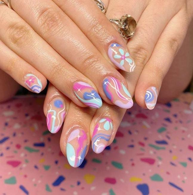 A mix of soft pastel swirls and simple flower designs create a whimsical yet elegant design. This nail art evokes feelings of lightness and warmth, ideal for the spring season.