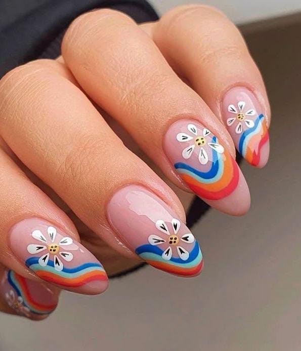 These nude pink nails with a bright mix of rainbow swirls and a vibrant blue flower at the yellow center, this design has an energetic and fun spring vibe. It feels youthful and lively.