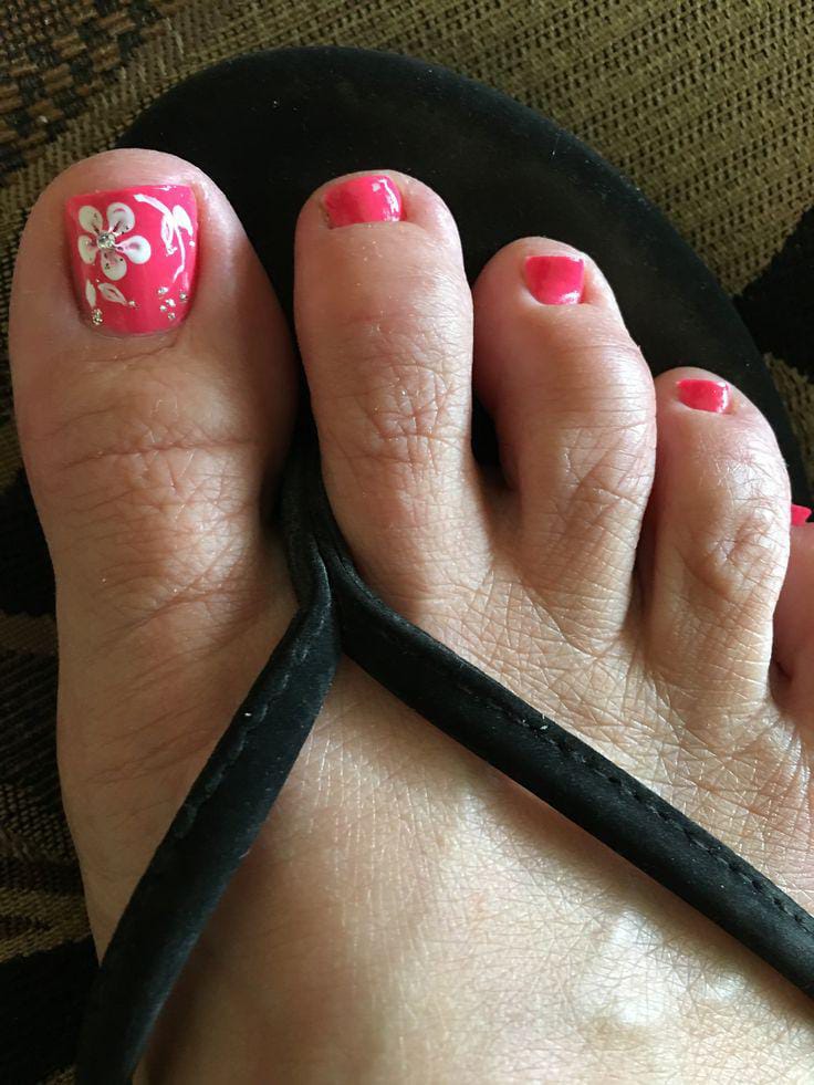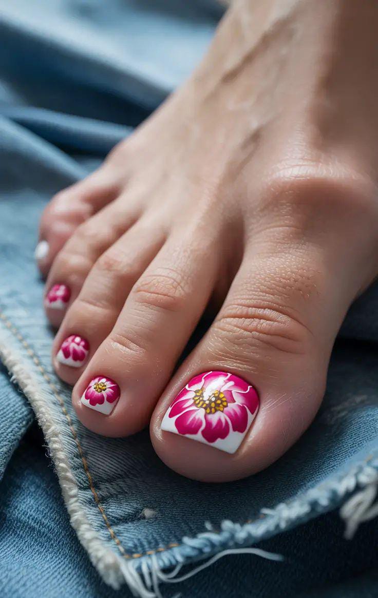 A lively pink nail base with a simple white floral accent on the big toe. The design is bold yet delicate, making it perfect for a sunny spring day.