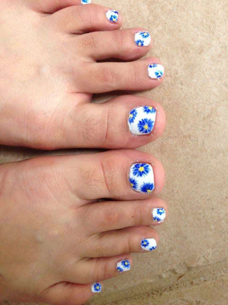 The design features a blue background with white daisies on the toes, giving it a fresh and playful feel, perfect for a carefree spring vibe.