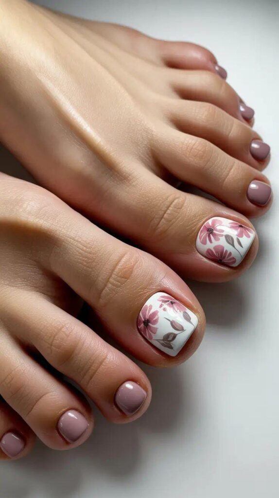 The soft mauve polish pairs nail beautifully with the elegant floral design on the white big toe base. It has a serene, soft, and feminine look, perfect for spring.