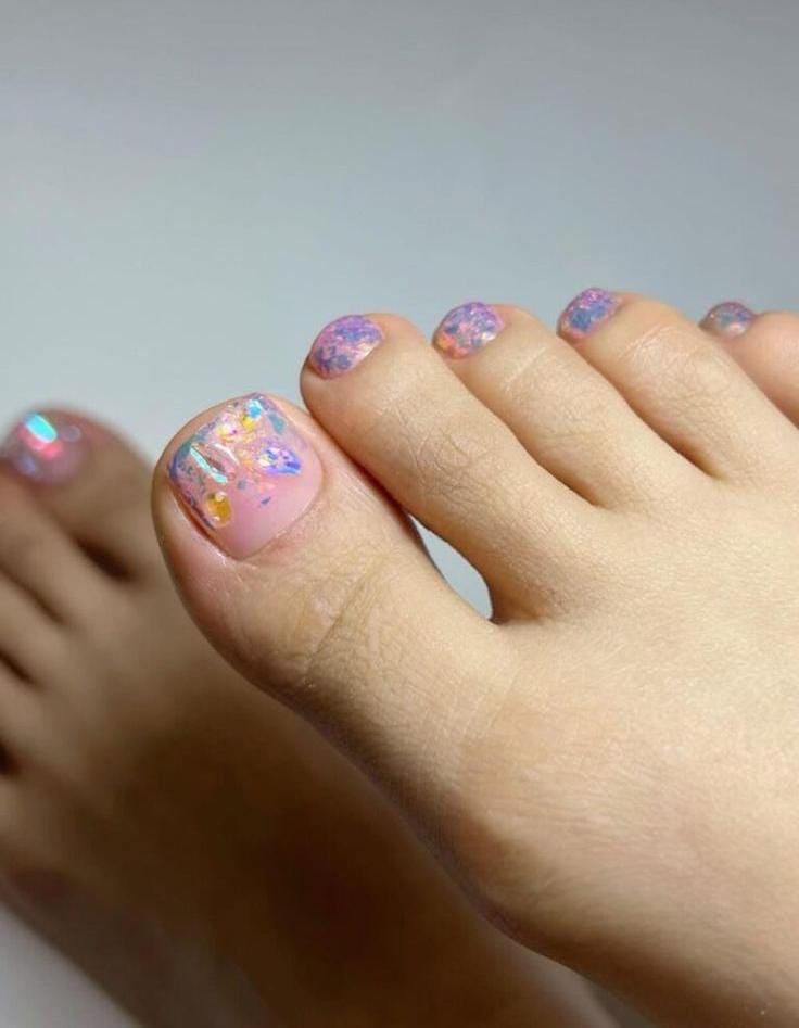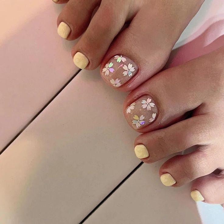 A neutral toe base with iridescent floral designs and yellow polish on the others. The soft colors and reflective shine give it a subtle yet elegant spring appearance.