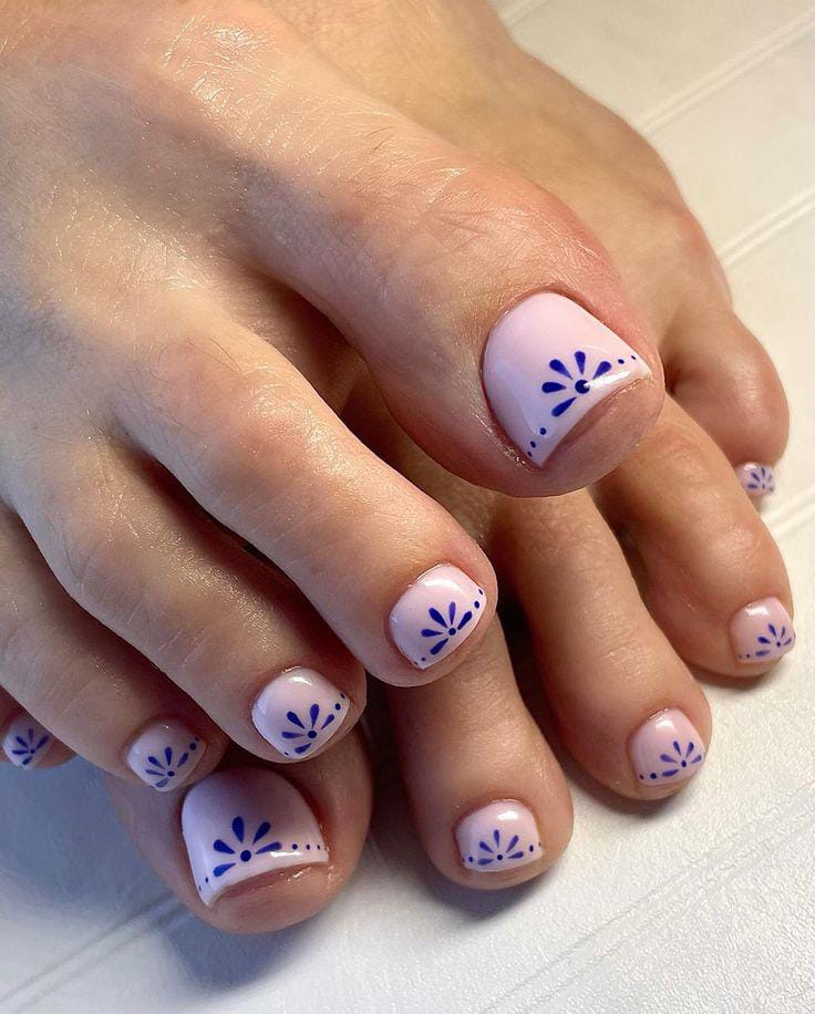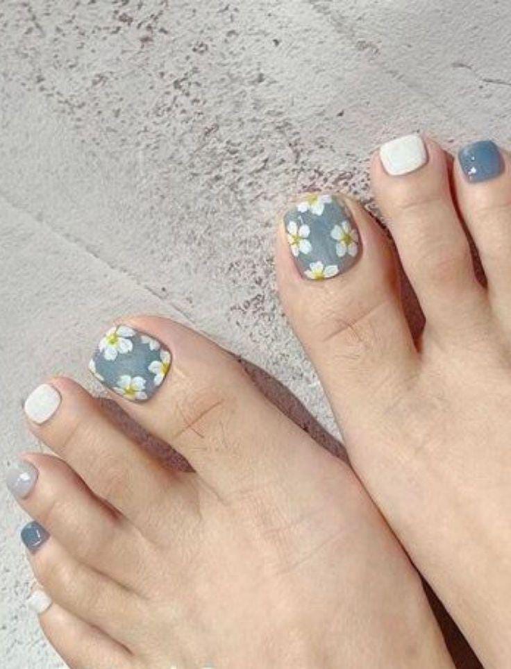 This gentle blue and soft nude toe base with delicate white floral patterns. The soft, calm tones give a fresh and serene vibe, perfect for a spring look.