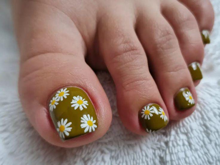 A playful design featuring a rich olive-green base with white daisy flowers scattered across the toes. This design has a warm, earthy vibe perfect for a cheerful spring look.