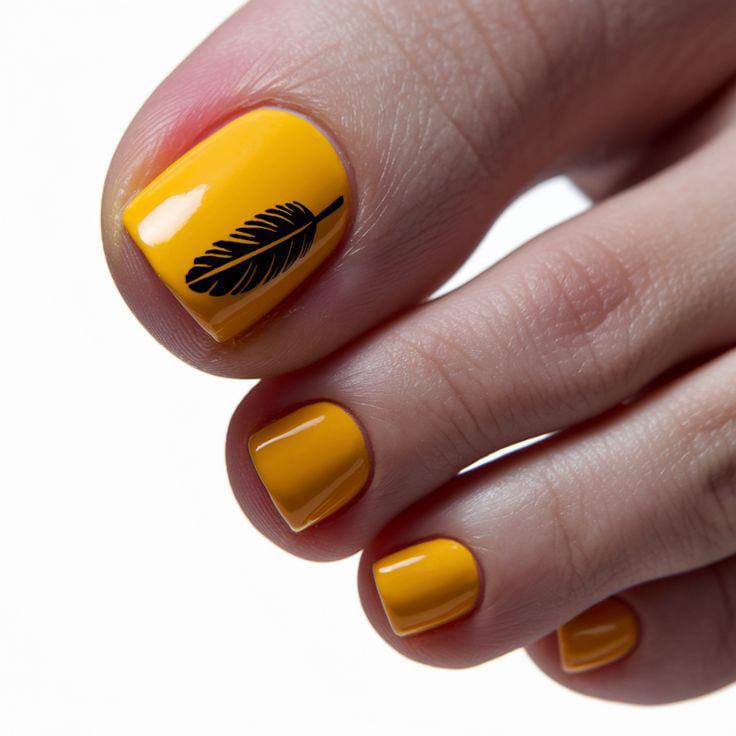 Vibrant yellow polish with a sleek black feather design on the big toe. A bold and minimalistic look, perfect for those who want a playful yet chic spring design.