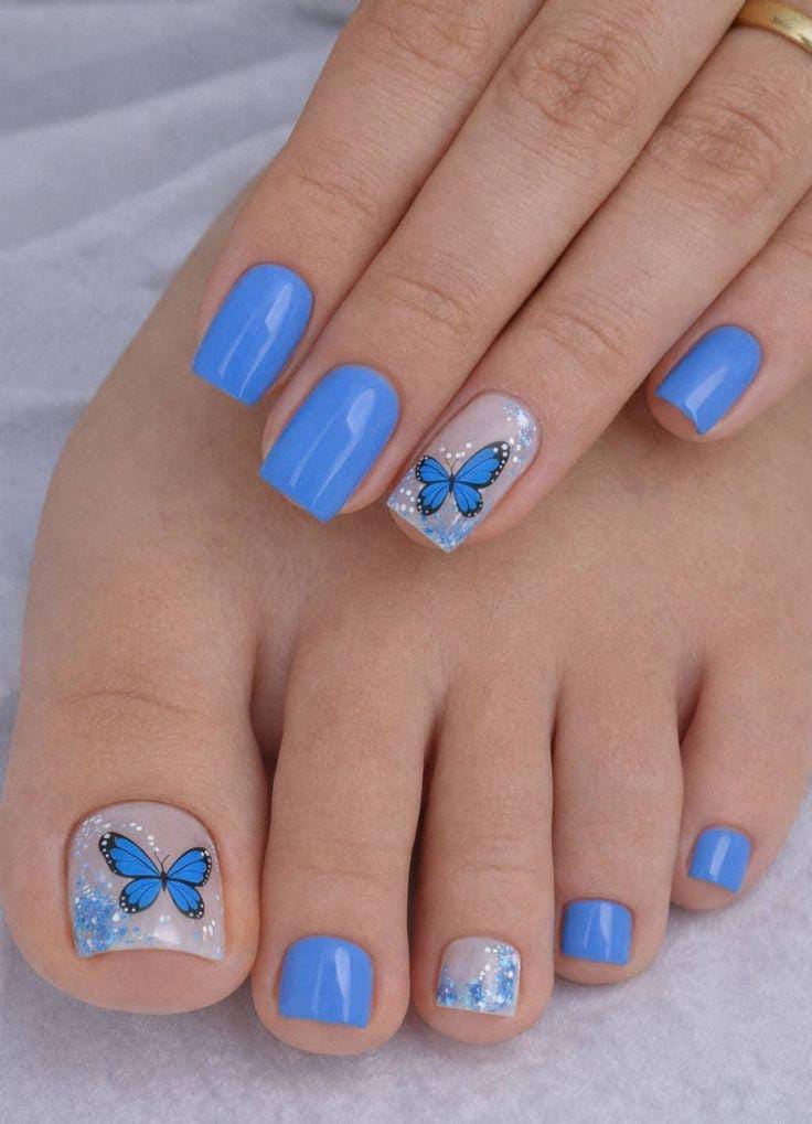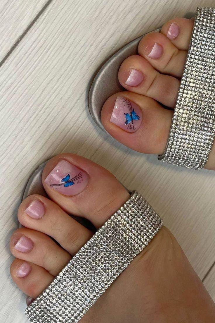 A soft, light pinkish-nude base with delicate butterfly art on each toe, offering a playful, feminine touch for spring.