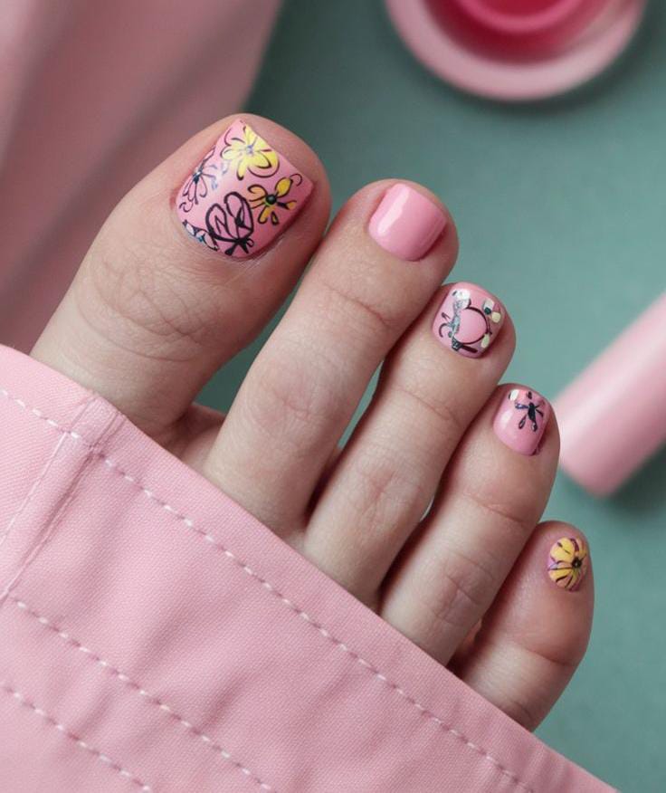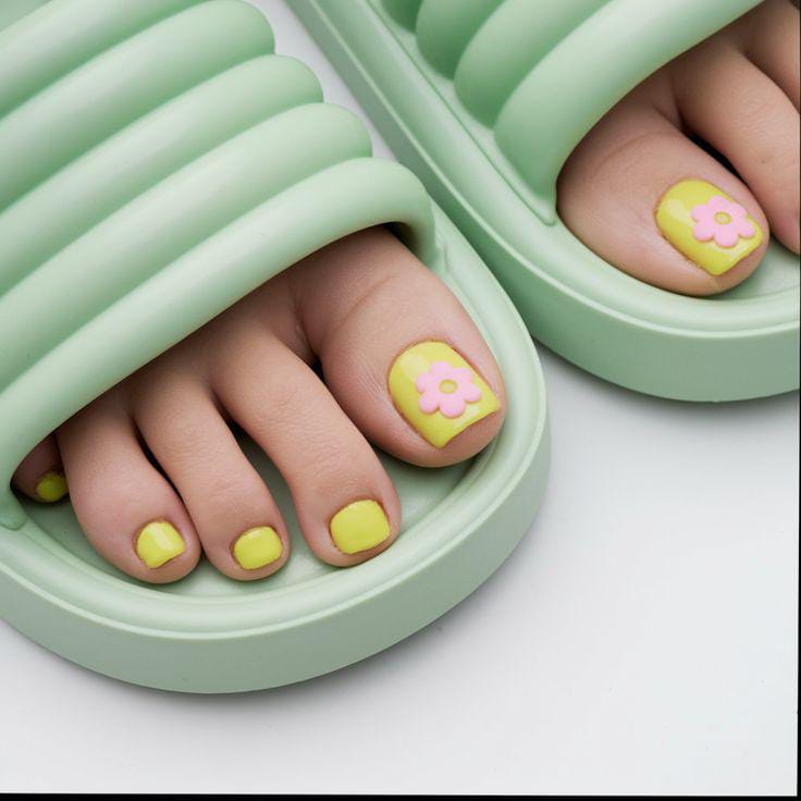 Bright yellow toes, paired with a playful pink flower design on the big toe, give this design a fun and cheerful vibe. The combination of pastel pink and fresh yellow captures the essence of springtime sweetness.