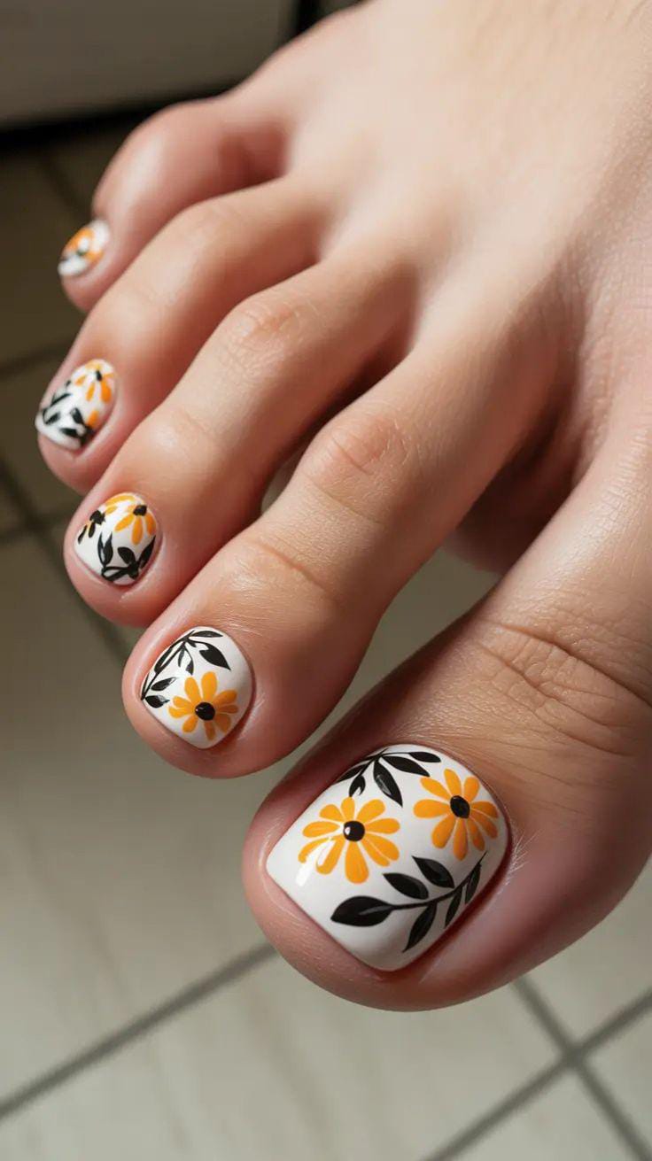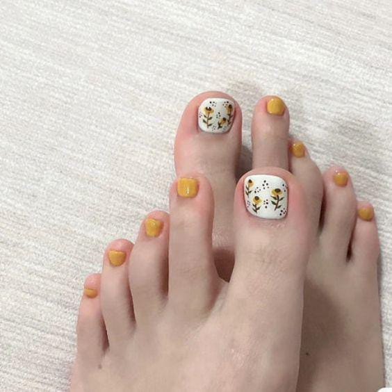 White background with yellow floral patterns on the big toes, and matching yellow polish on the smaller nails. It’s a warm and vibrant spring look.