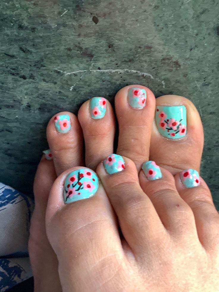 This design features a bright red and white polish with a cute cherry pattern on the big toe. It gives a fun and fresh vibe, perfect for spring.