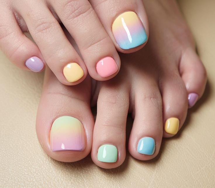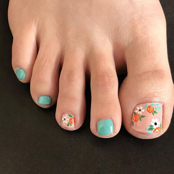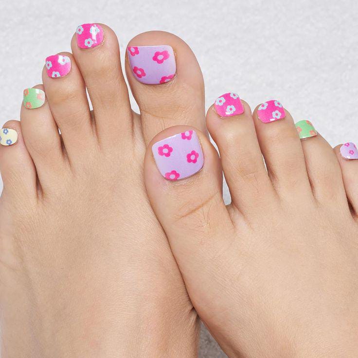 This beautiful mix of pastel colors, including light pink, lavender, and mint green, with cute floral accents scattered across the toes. The combination of soft colors and floral patterns gives this design a fresh and dreamy spring feel.