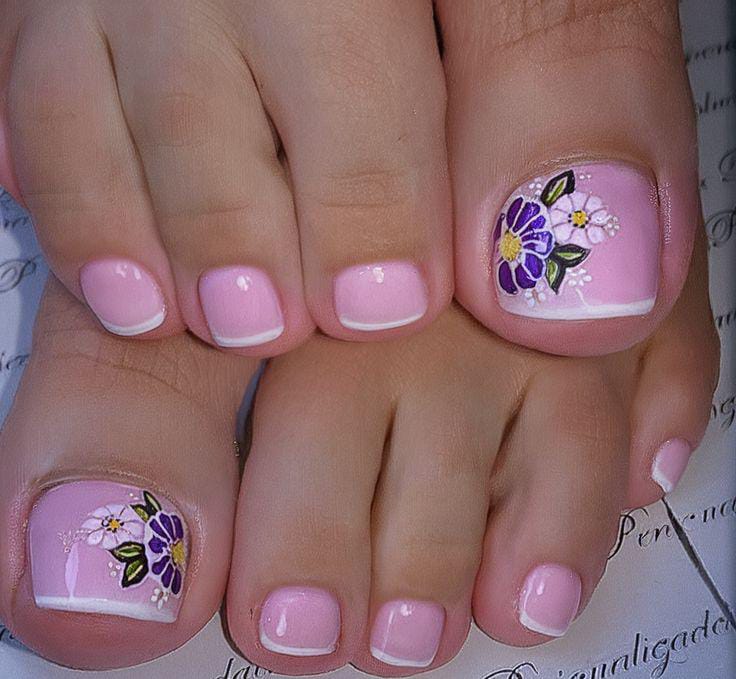 This soft pink base with simple white French tips and purple flowers, green leaves. It’s a sophisticated and feminine look with a touch of floral spring charm.