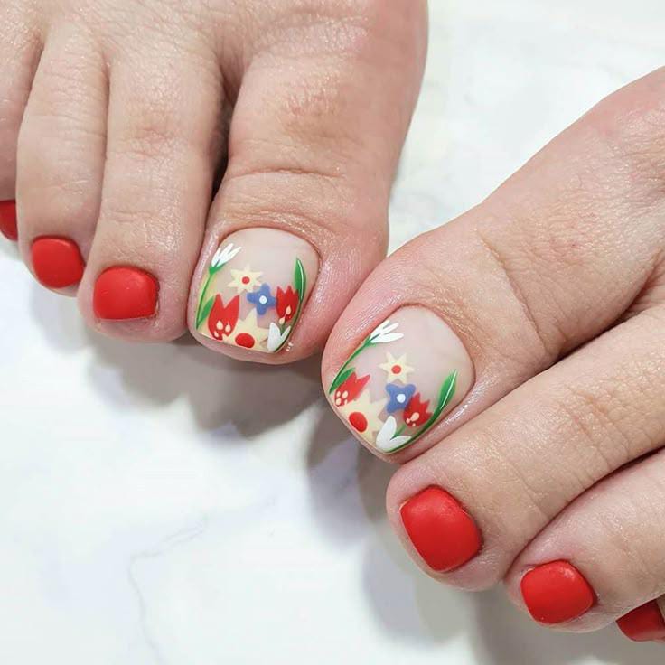 Bright orange red polish on most toes with a subtle floral design on the big toes. It gives off a fresh, vibrant vibe that screams springtime joy and renewal.