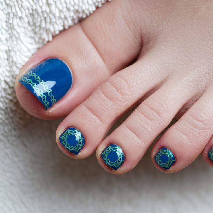 A bold blue base with vibrant green geometric patterns at the tips of the toes, giving it a modern, striking look perfect for any trendy fashionista and best spring design.