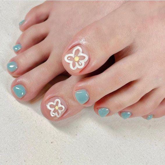 Soft pastel blue nails with a white flower design on the nude big toes base, creating a calm, nature-inspired aesthetic.