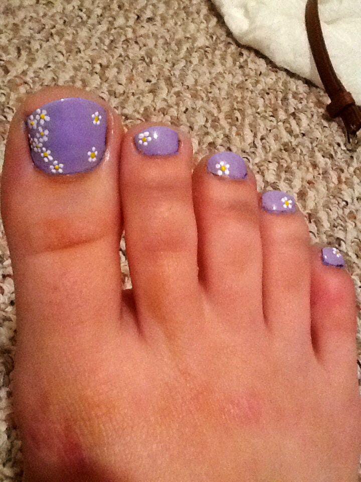 A lovely lavender base with small, white daisy flowers scattered across the toes, giving off a sweet and whimsical vibe perfect for spring.