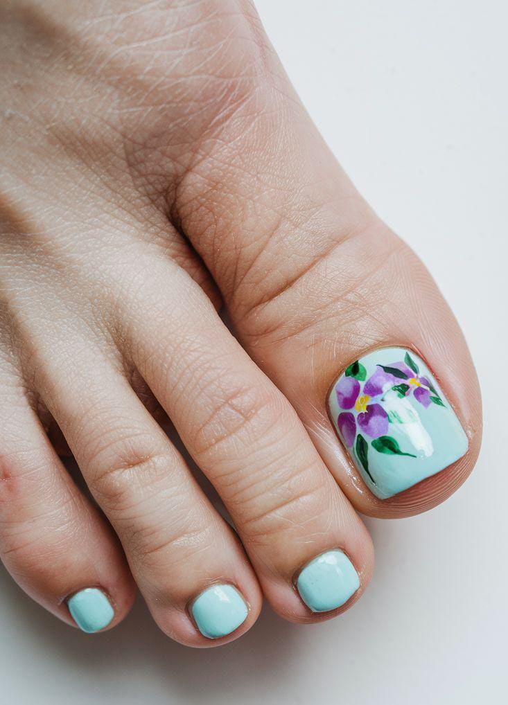 A refreshing mint base on the nails with delicate violet flowers on the big toes, bringing in a soft, floral spring feel.