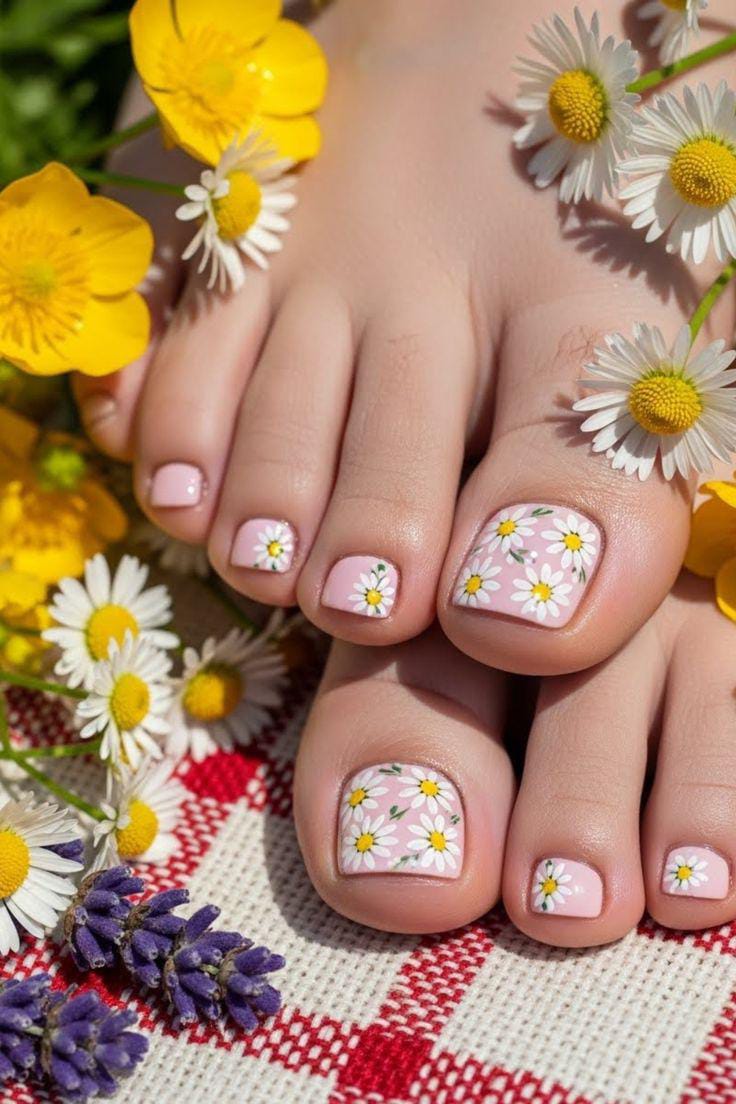 A soft pink base serves as the perfect canvas for delicate, hand-painted white daisies scattered across the nails and toes. The simplicity and charm of the floral accents that evokes images of springtime flowers in full bloom.