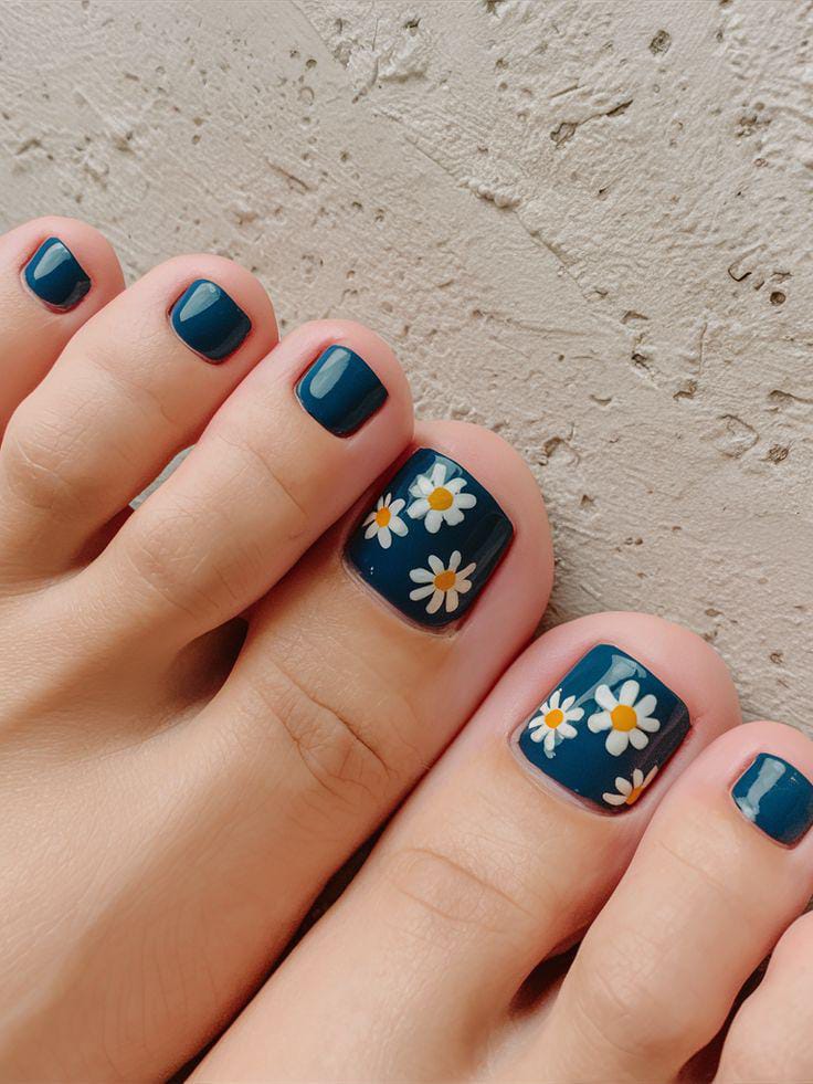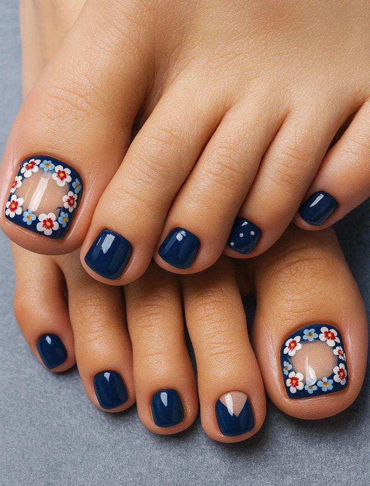Dark blue polish with a floral design around the big toe in white, red and light blue. It combines boldness and a touch of whimsy, bringing an energetic spring vibe.