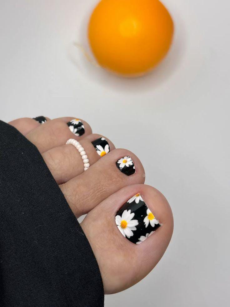 A bold black background with crisp white daisies scattered across the toes. This design adds a fun, retro touch to your spring look.