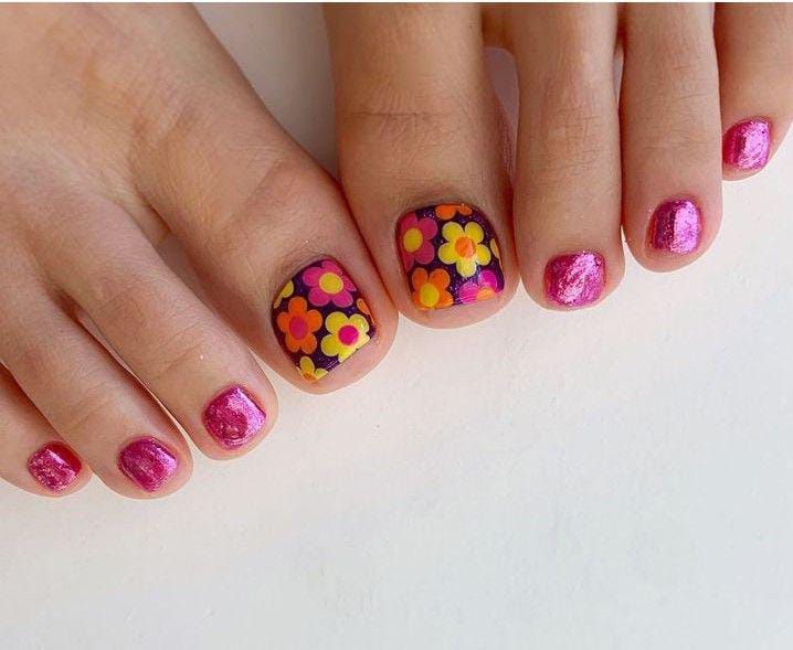 A fun and vibrant design featuring a deep purple background with bright yellow and pink flowers scattered across the big toe. The other toes are polished in a shimmering pink that complements the bold floral spring pattern.