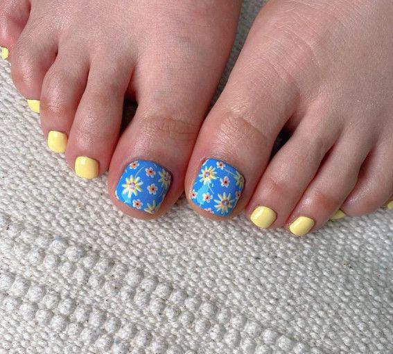A vibrant blue background on the big toe is adorned with small, crisp white daisies, while the other toes are painted in a bright and cheerful yellow. This design evokes the feel of clear spring skies and sunny days.