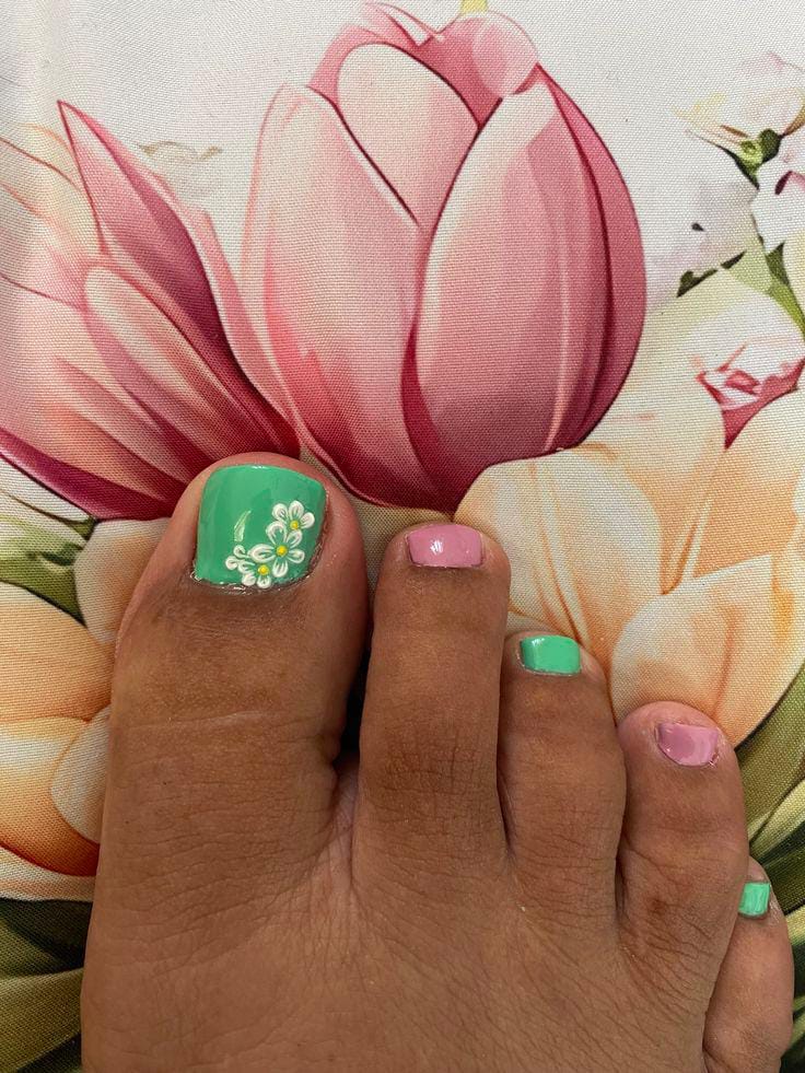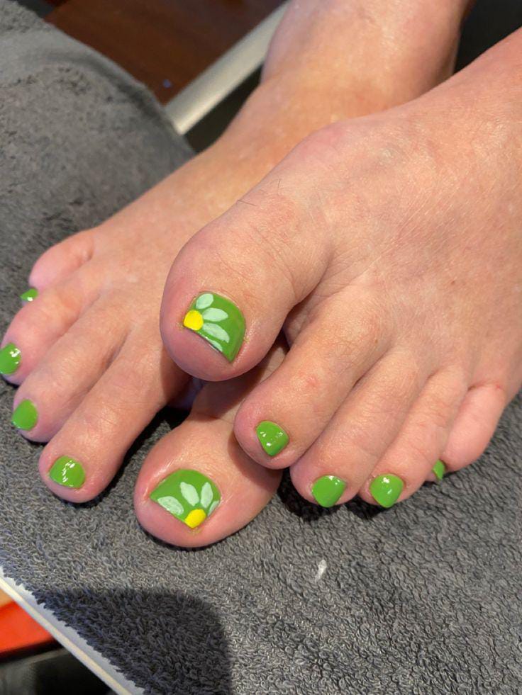 Soft pastel green with a subtle flower detail on the big toe, and light pink accents on the other nails. A serene and nature-inspired design ideal for springtime.