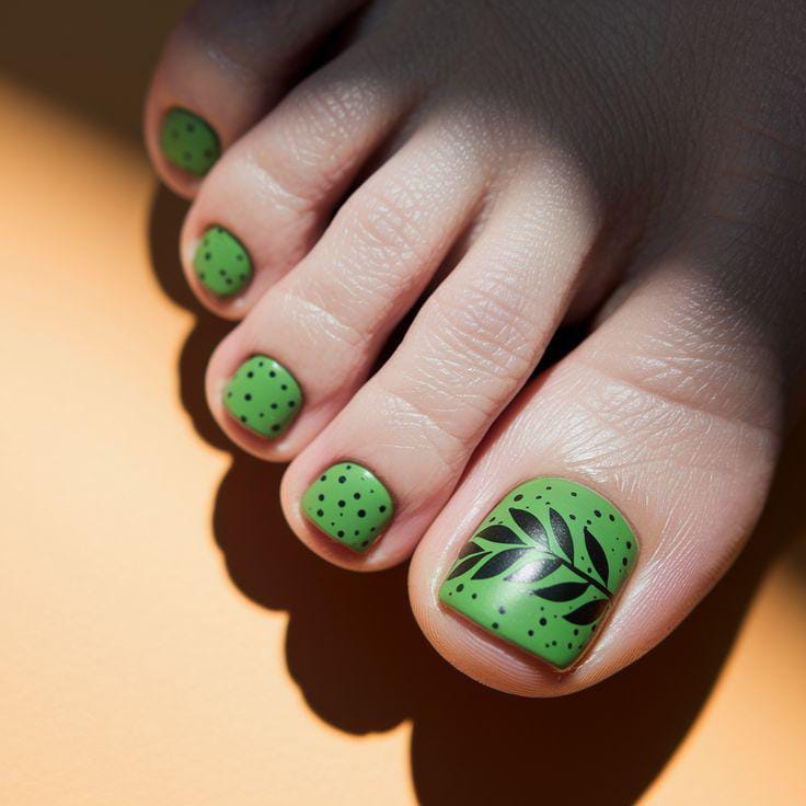 A fresh green base with subtle black dots and a nature-inspired leaf design on the big toe. It radiates calm and earthy vibes for a natural, balanced spring look.