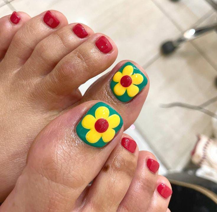 Bright green toes with yellow flower- center red patterned accents, and red other accent nails. This playful design combines bold color with fun floral spring.