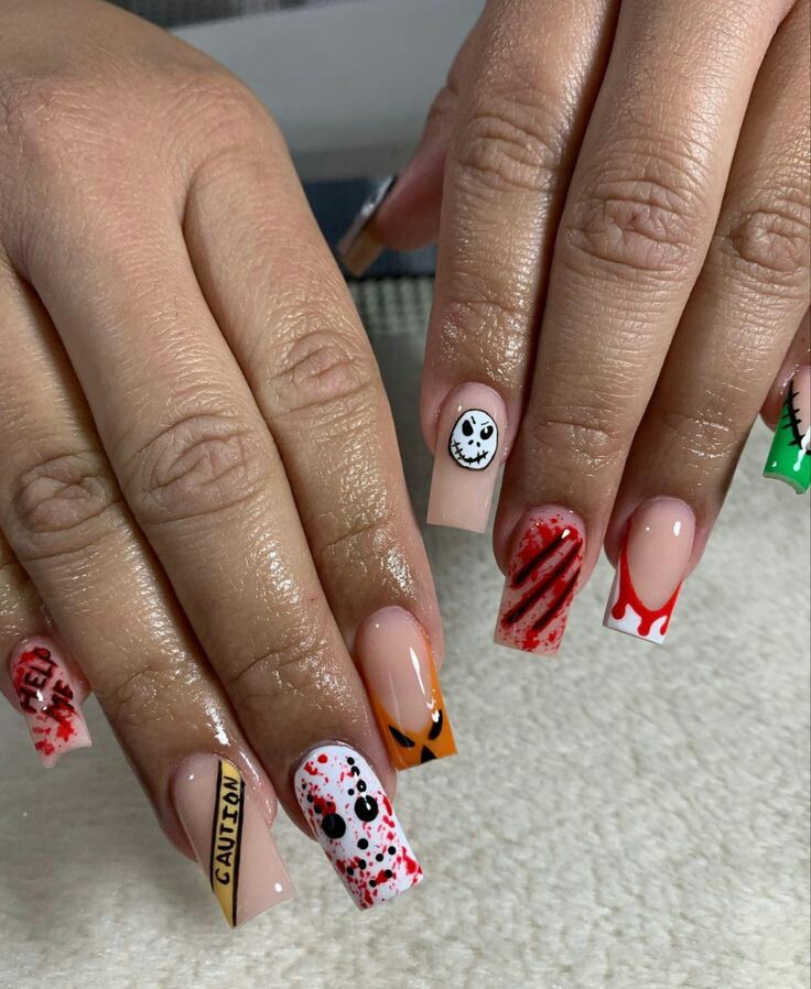 Nude french nails topped with bloody splatters, eerie faces, and dark details, giving off a scary slasher-movie feel.