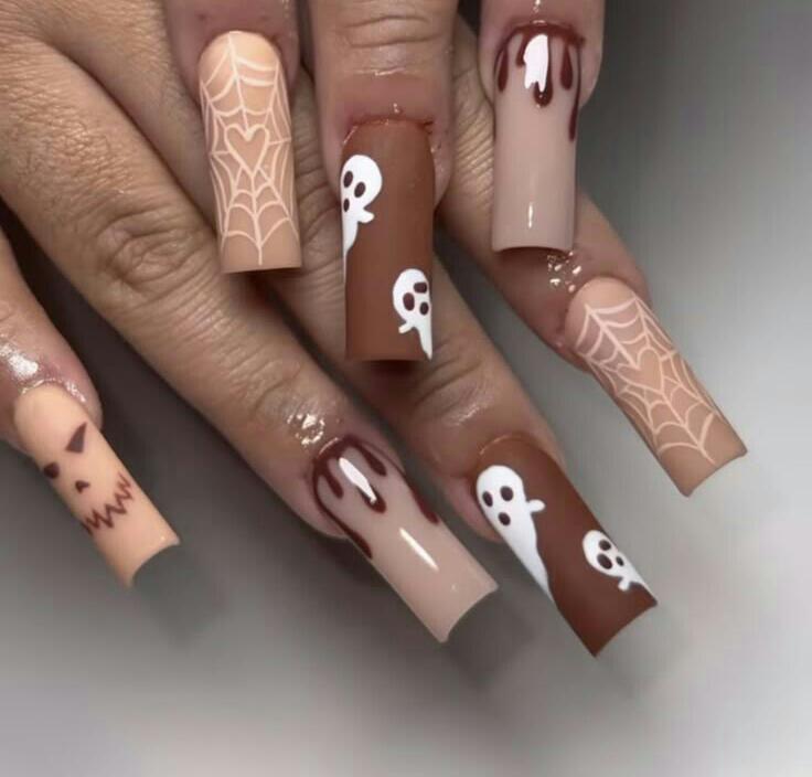 Warm nude and brown tones with white ghosts, spider webs, and dripping effects for a playful but eerie Halloween style.