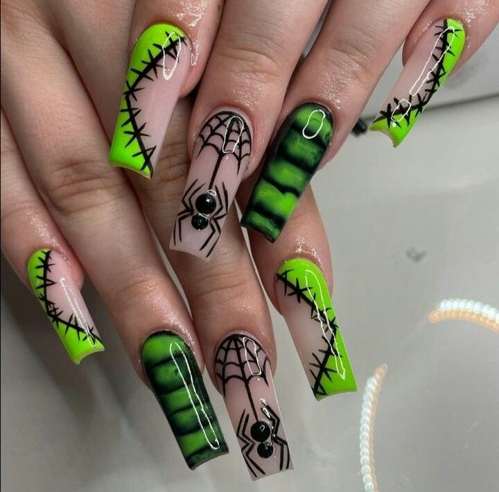 Bright neon green nails with black stitch patterns and creepy spiderweb accents for a bold Frankenstein-inspired vibe.